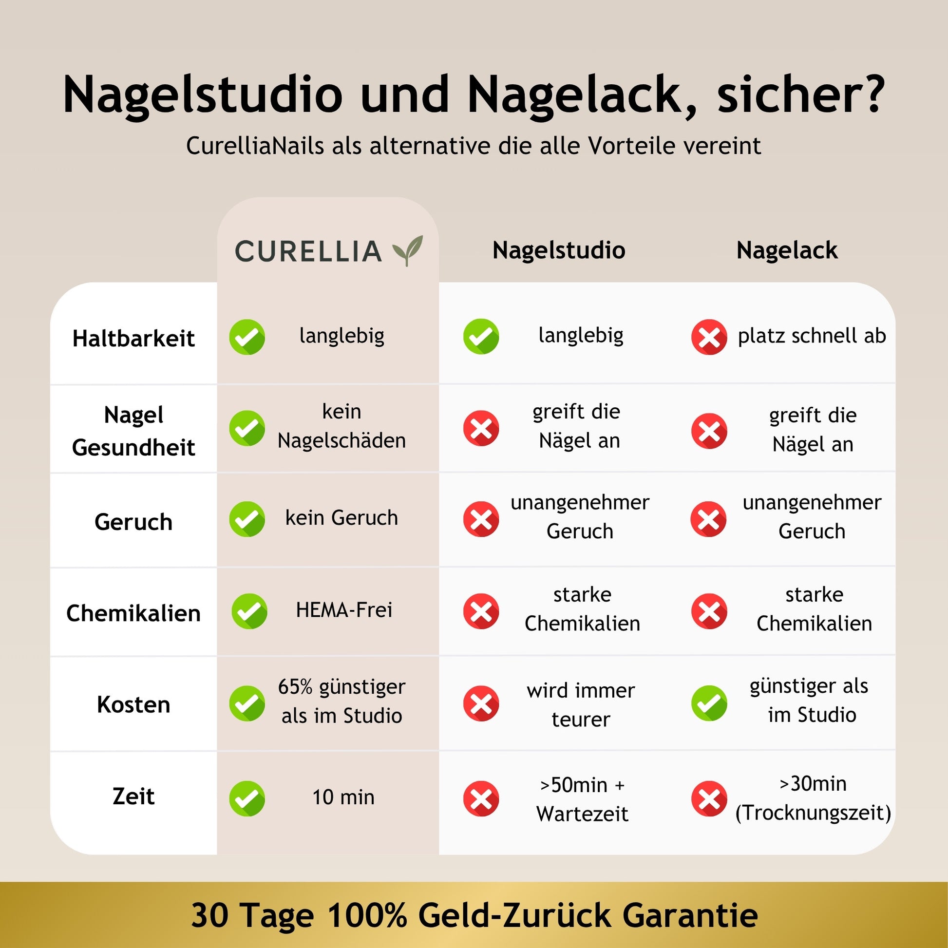 Bei richtiger Vorbereitung und Anwendung halten Curellia Nails bis zu 2 Wochen oder länger – für dauerhaft gepflegte Nägel ohne Absplittern.