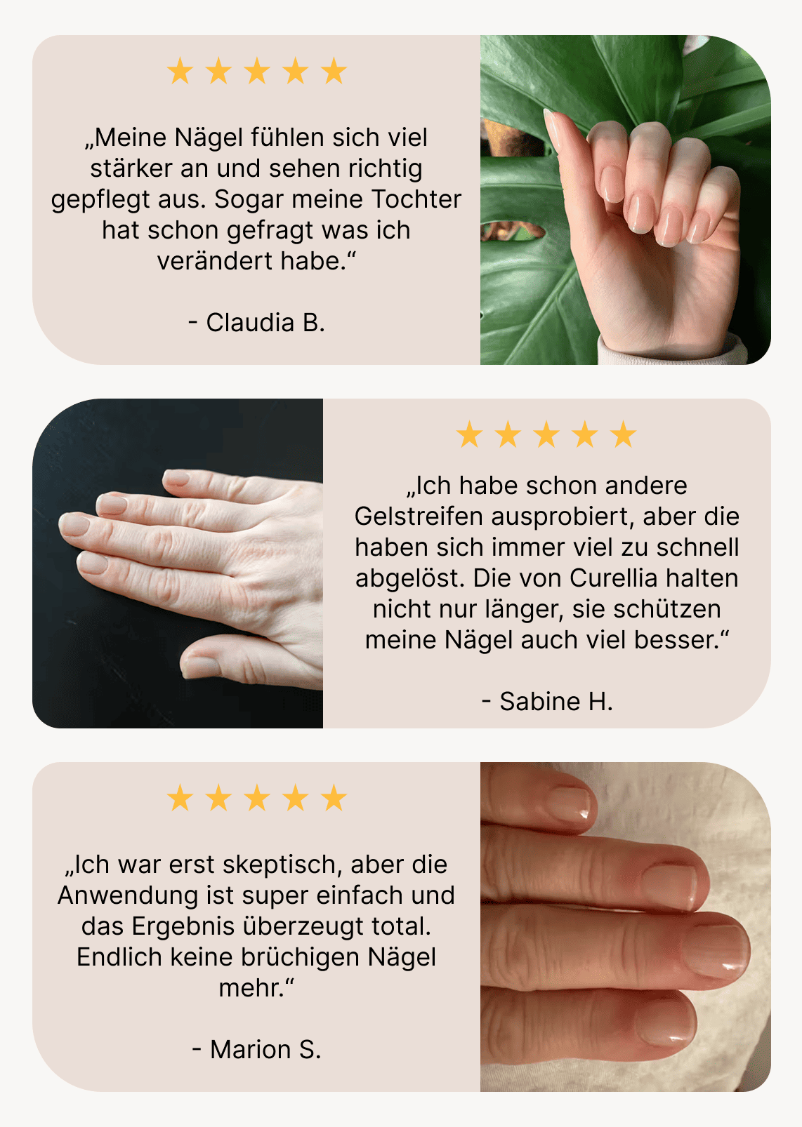 Gesunde Nägel geben dir Selbstvertrauen. Mit Curellia musst du dich nicht mehr verstecken, sondern kannst dich sorglos zeigen.